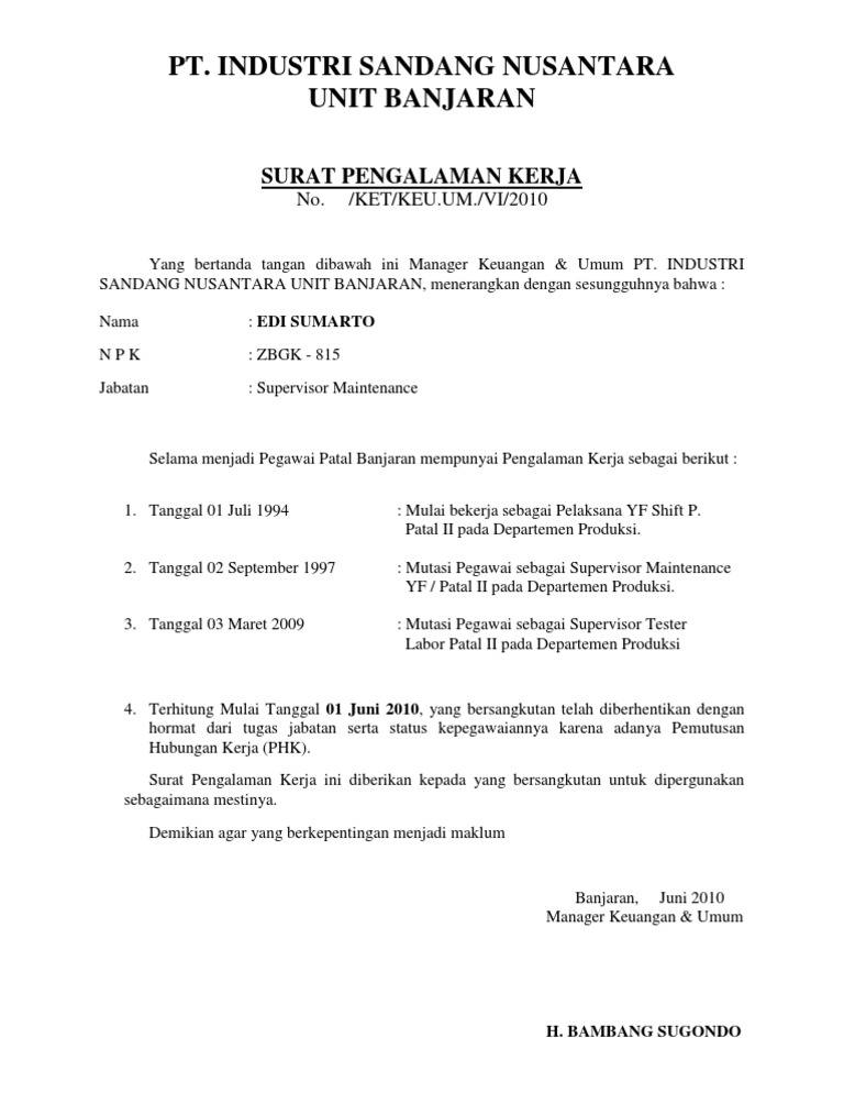 Setelah mempelajari format dan cara penulisan surat pengalaman kerja di atas, kamu bisa lanjutkan dengan melihat berbagai contoh jadinya di. Maksud dari surat pengalaman kerja ini adalah untuk menerangkan bahwa yang bersangkutan pernah bekerja pada perusahaan tersebut. Contoh surat lamaran kerja tentunya berbeda beda jenisnya tergantung akan dikirim keperusahaan seperti apa , atau mau digunakan. Bagi guru, surat pengalaman kerja ini di tandatangani oleh penanggung jawab instansi tempat guru tesebut bernaung. Memiliki karir yang bagus di sebuah perusahaan tentu merupakan hal yang sangat diimpikan oleh setiap orang.